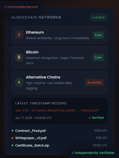 ICOStamp supports Ethereum and Bitcoin, both of which can be independently verified through publicly available blockchain explorers. The platform also supports alternative chains for specific use cases. Your choice of network affects external verifiability, so select based on who needs to verify your records.