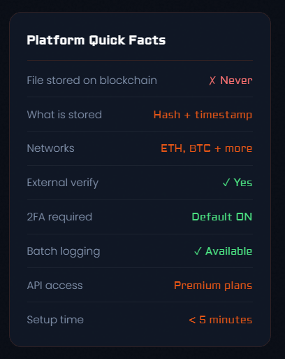 Under 5 minutes. No blockchain expertise required. File content never leaves your device.