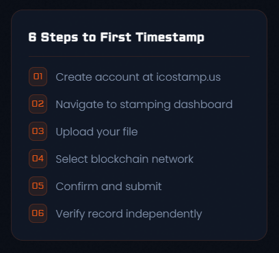 Create an account at icostamp.us, enable two-factor authentication, and use the Document Stamp tool for your first record. The process takes under five minutes for a single document. For batch workflows or API integration, the platform documentation walks through each setup step.