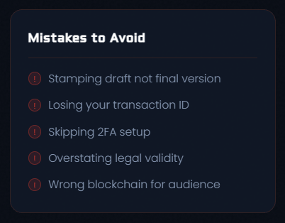 This is the most frequent error. If you stamp a document before finalizing it, any later changes create a hash mismatch. You'd need to stamp again, which creates two records and potential confusion. Always stamp the final, signed version.